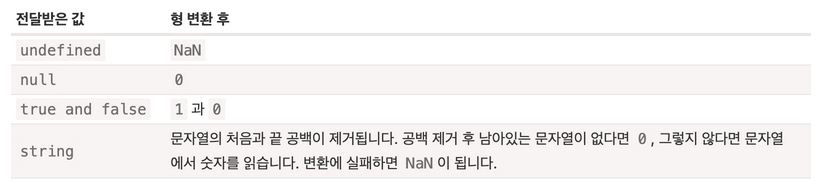 Number(value) 함수를 사용하면 주어진 값(value)을 숫자형으로 명시해서 변환할 수 있다.