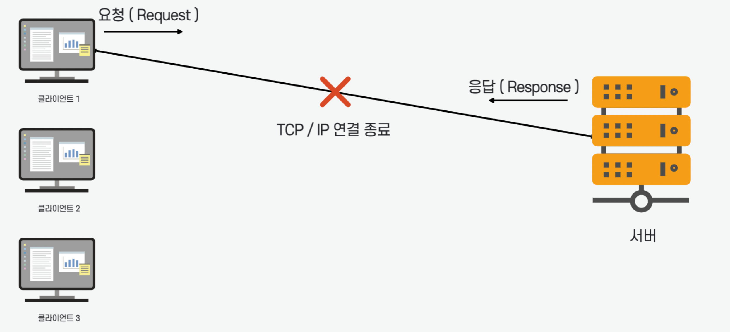 연결을 유지하지 않는 모델은 클라이언트 1이 요청을 하고 서버가 응답을 주고 나면 연결을 바로 끊어버린다.