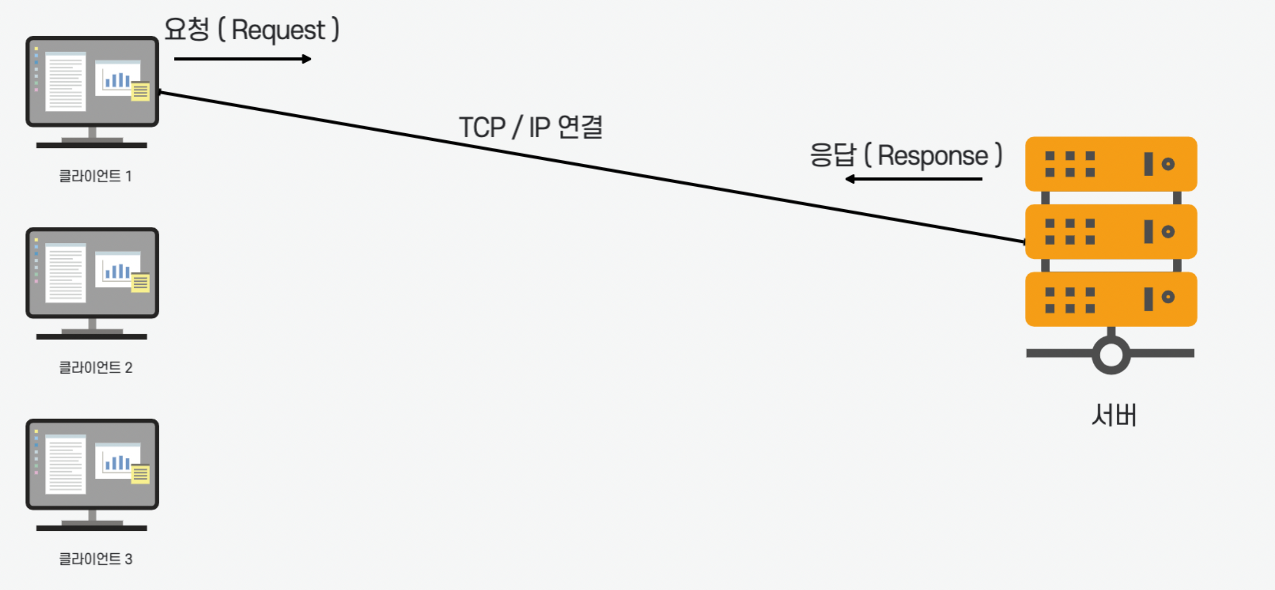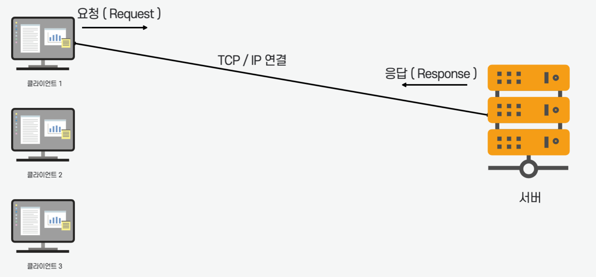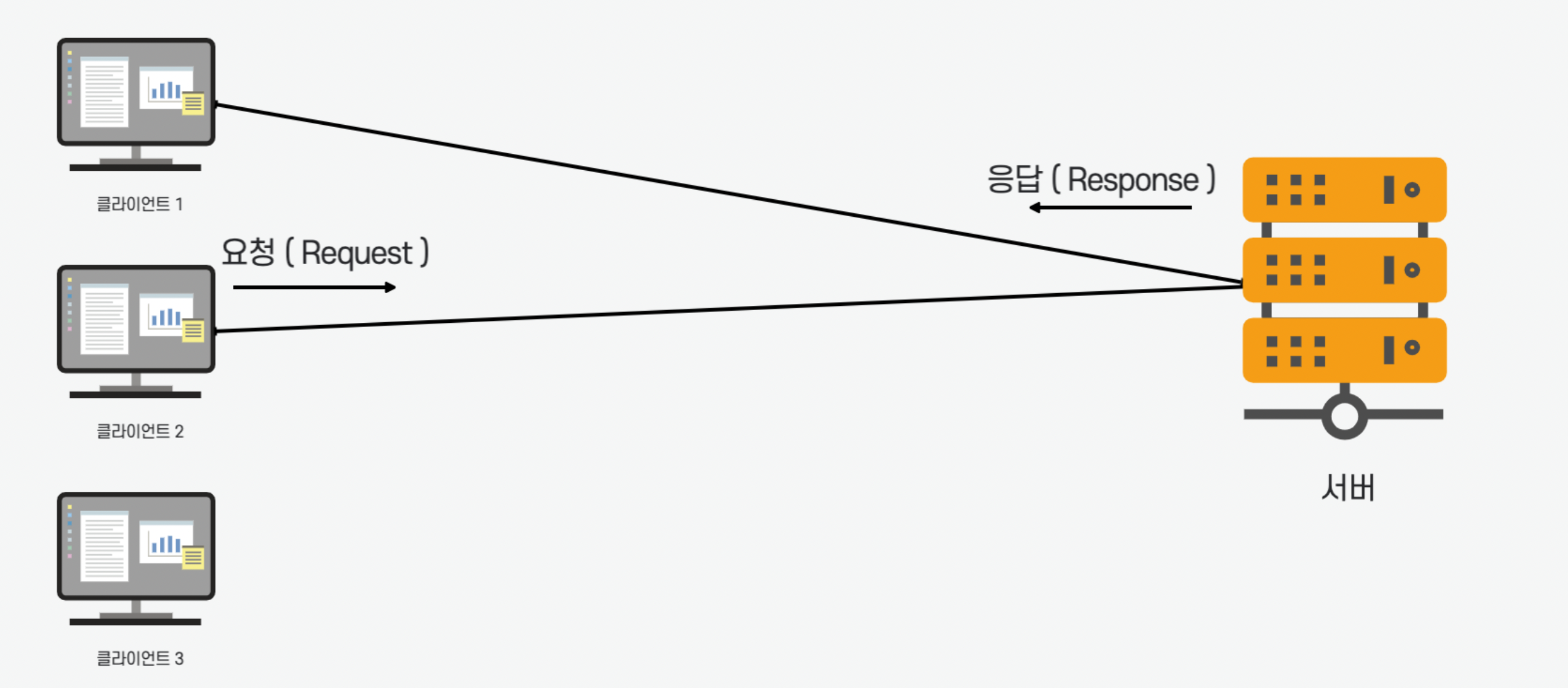 클라이언트 1이 요청을 하고 서버가 응답을 준다. 그리고 클라이언트 2가 요청을 하고 서버가 응답을 준다.