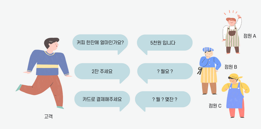 고객은 같은 말을 하겠지만 점원 A -> 점원 B에게 상황을 전달하지 않는 이상 무슨 말을 하는지 모를 것이다.