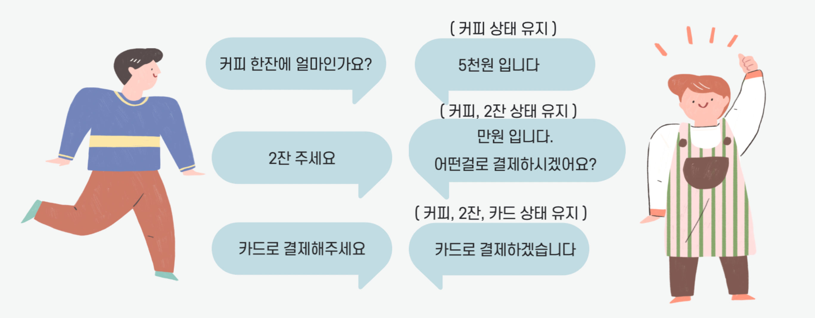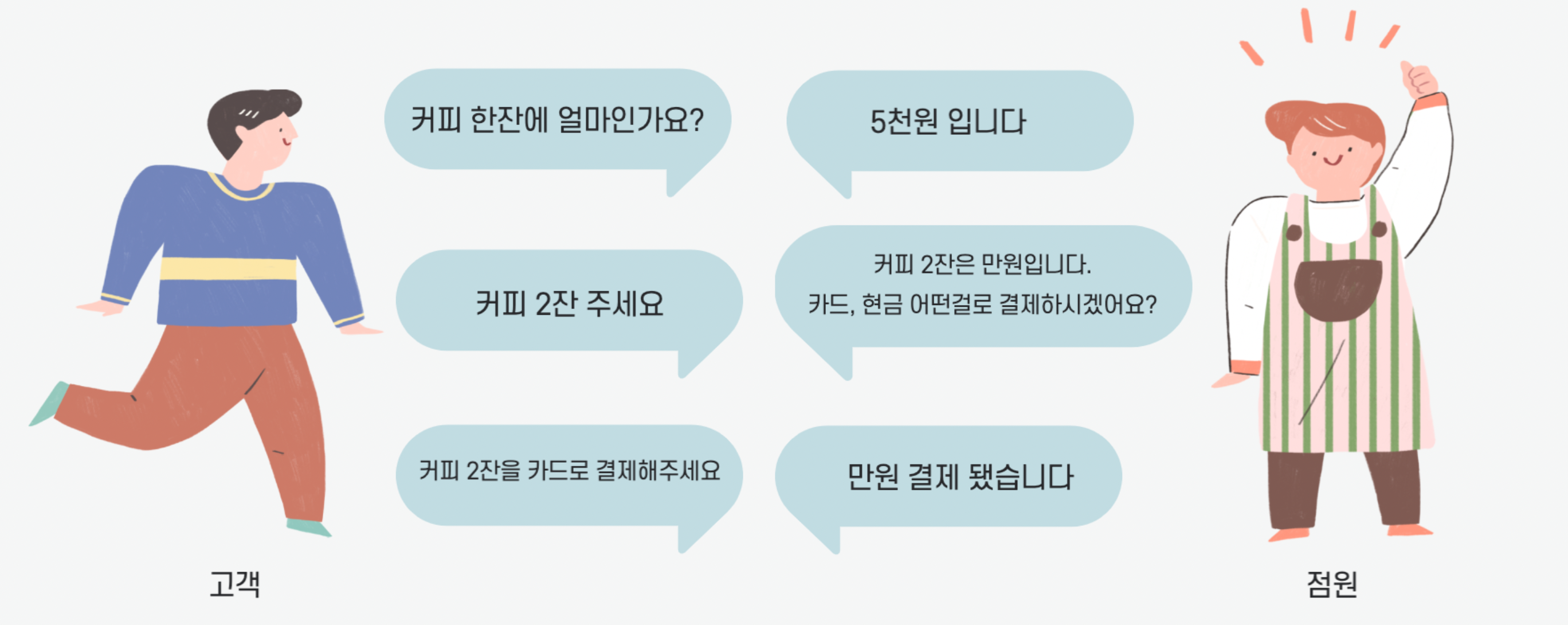 우리가 카페를 갔다고 생각해보자. 커피를 주문하기 위한 고객과 점원의 대화이다.