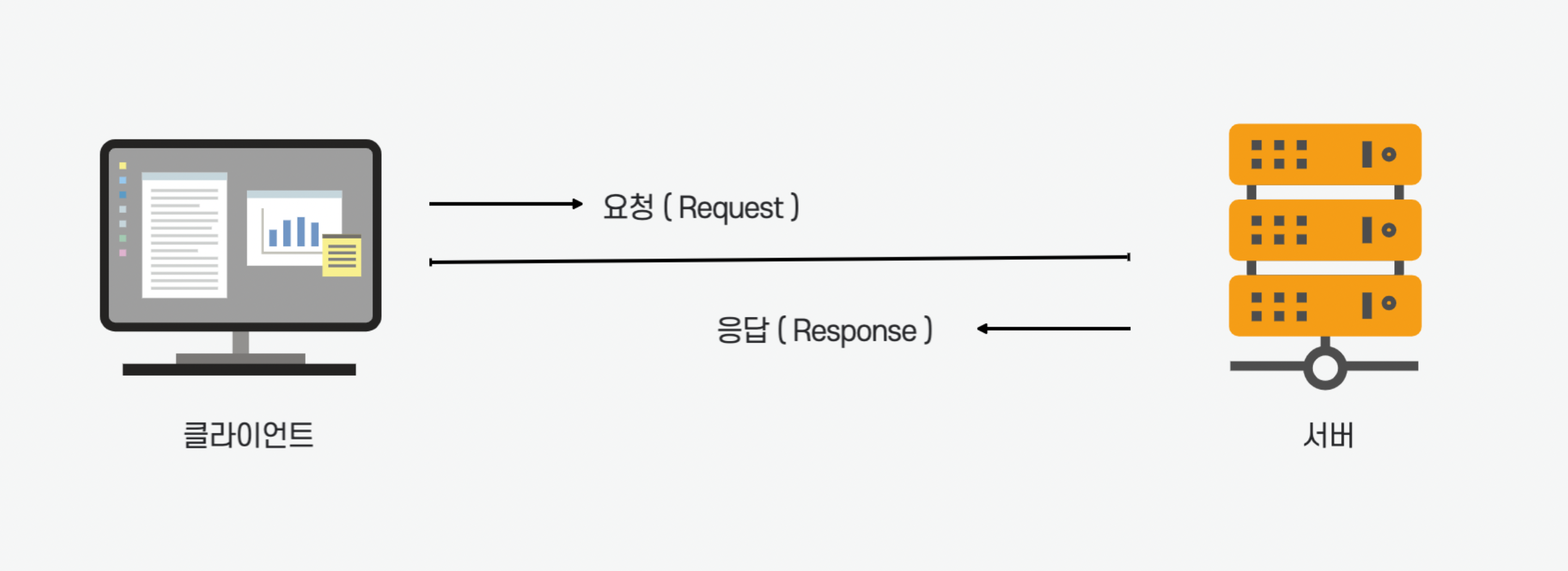요청(Request), 응답(Response) 구조로 나누어져 있으며 클라이언트는 서버에 요청을 보내고 서버는 요청에 대한 결과를 만들어서 응답하는 구조이다.