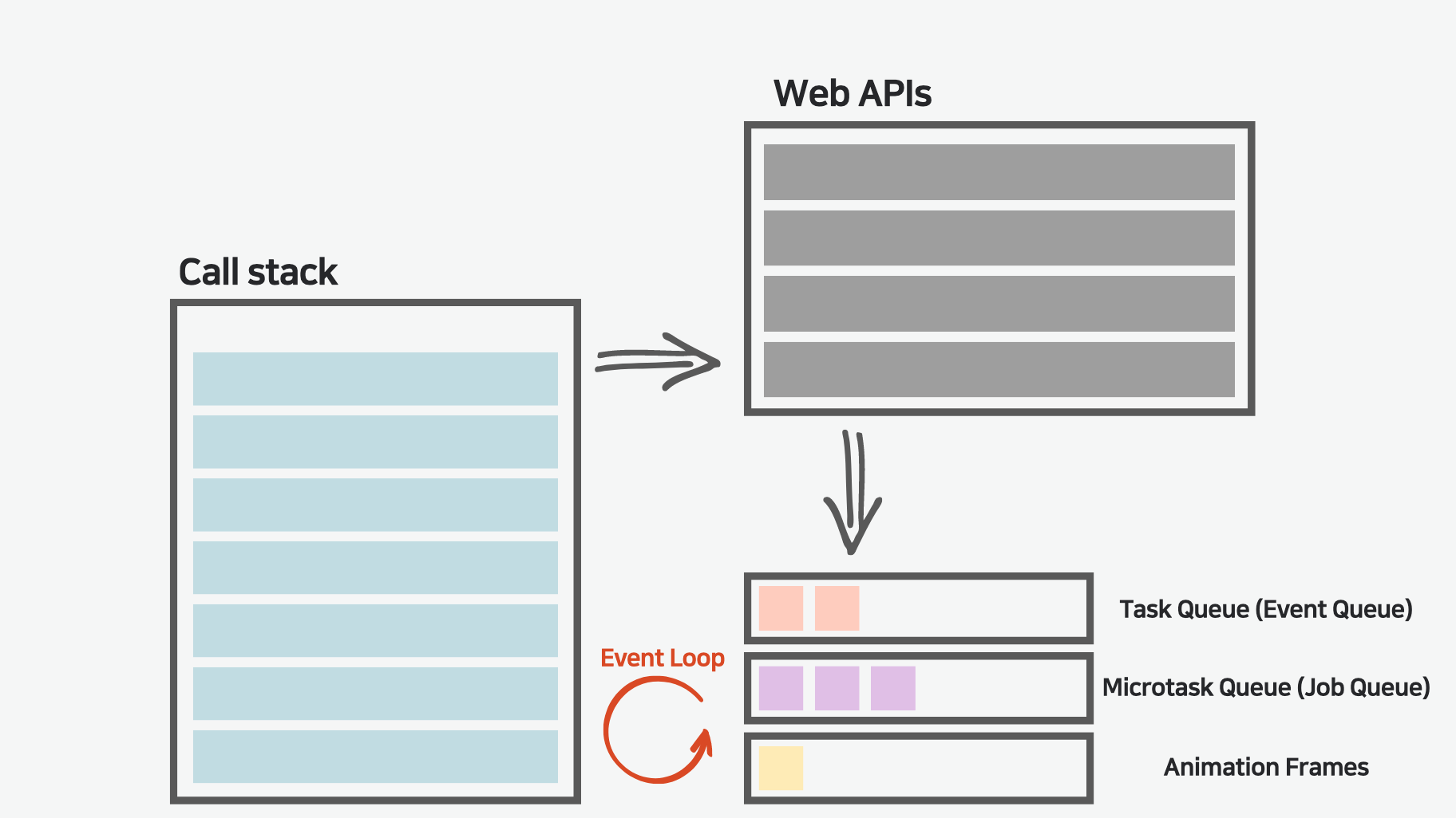정리해보자면, 어떤 콜백 함수인지 판단하여 Task Queue, Microtask Queue, Animation Frames 안에 넣고,