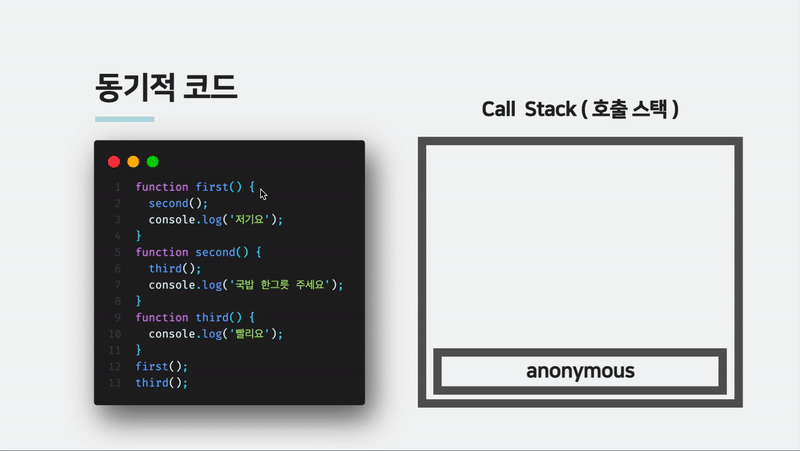 콜 스택이 비어있기 때문에 익명 함수를 콜 스택에 넣을 수 있는 것이고, 이게 이벤트 루프가 하는 역할이다.