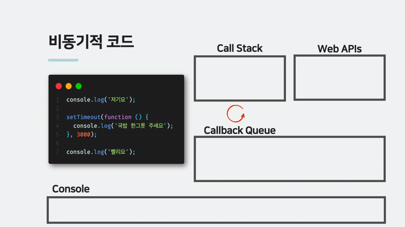 콜 스택에 setTimeout함수가 들어오니 실행하지 않고 일단 Web APIs로 보낸다.